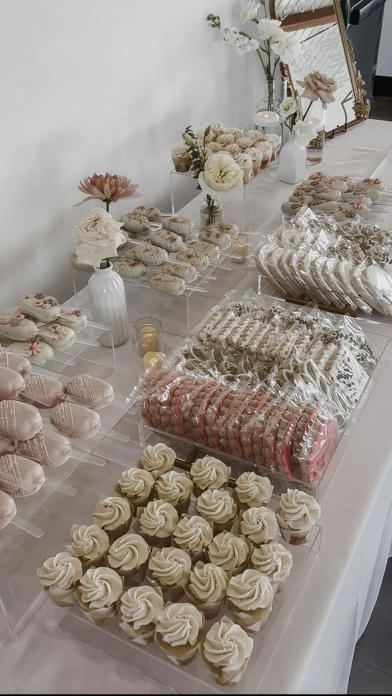 Want something super custom to your wedding colors and you + your partner? Sugar cookies are a great dessert table filler that your guest can take home with them if they want a sweet treat on the way home! Each cookie comes individually heat sealed in clear packaging making it easy for guest to grab and go & helps them stay fresher/softer longer. Message us about pricing and designs!